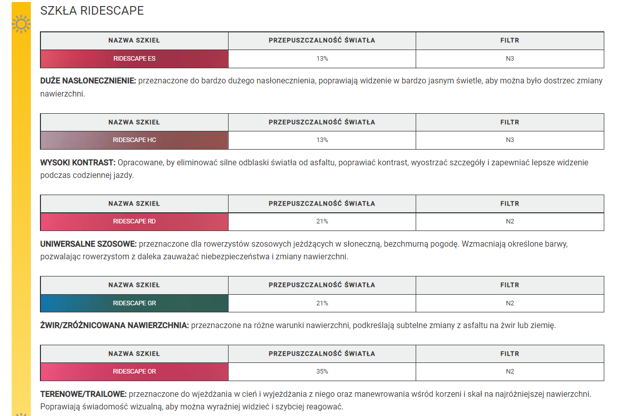 - Szkła RIDESCAPE są dobrane tak, aby zapewniały większy kontrast i wyraźny obraz w każdej scenerii podczas jazdy.